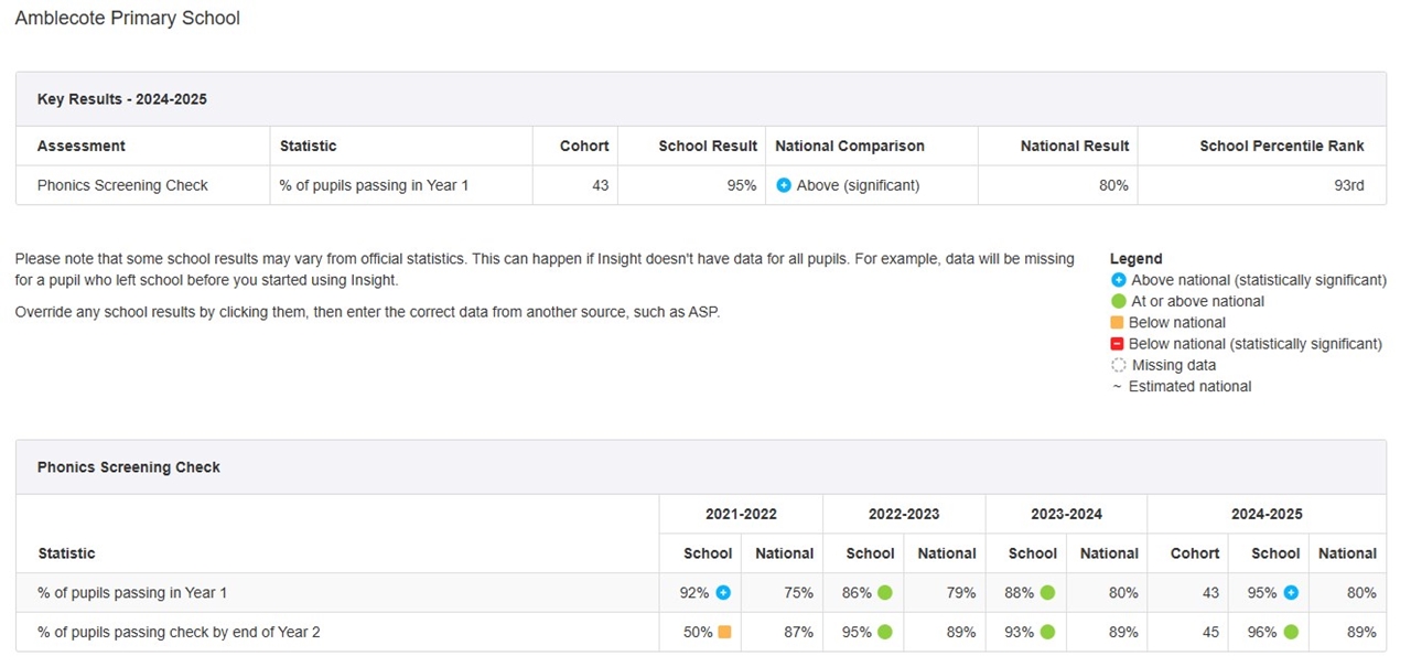 The check consists of 20 real words and 20 pseudo-words that a pupil reads aloud to the teacher. In 2024, pupils needed to attain 32 or more words to achieve the phonics screening check.